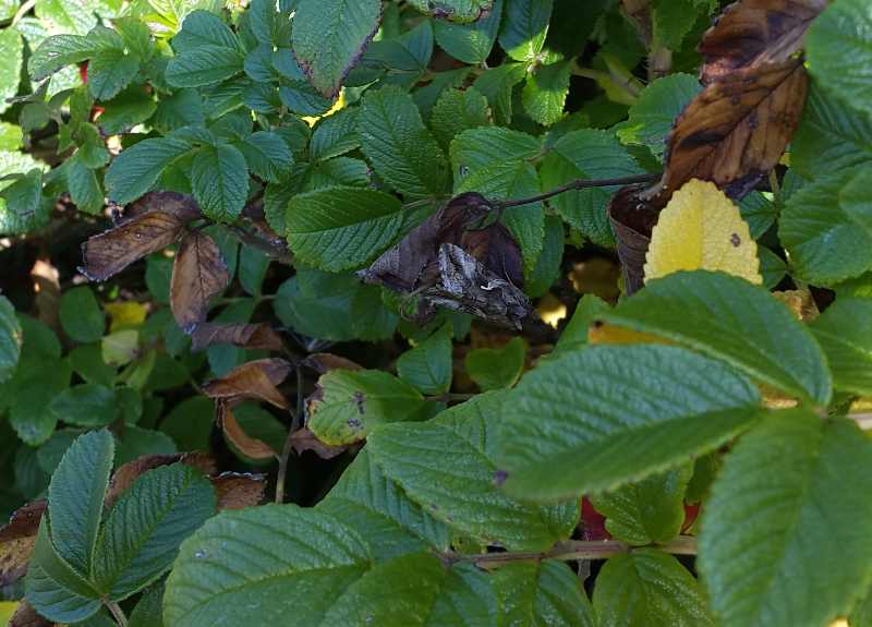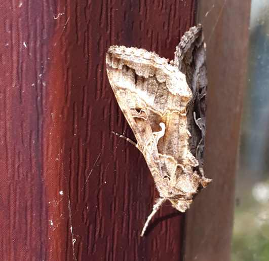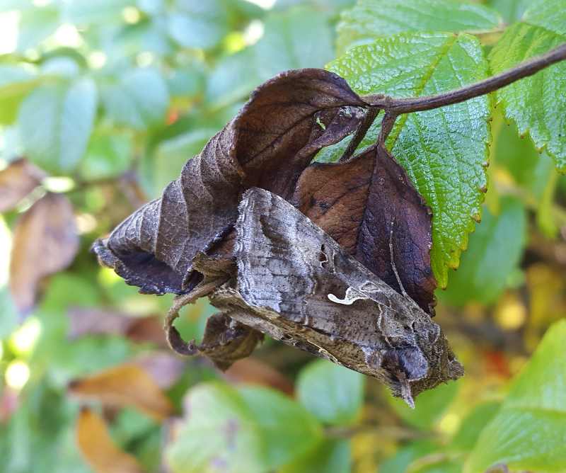 The photographs here show silver Y moths (Autographa gamma), as found in the countryside in England in September 2021. They had a mottled grey and light brown colour. On each wing was a prominent, short, white line, forked about half way down its length and reminiscent of a bent letter "y". The first two photographs are of the same moth on a leaf on cultivated bushes of Rosa rugosa. Although most of the leaves on the bushes were green, the moth was resting on a dead leaf where it blended in, as shown in the second photograph. The third photograph shows a silver Y moth resting on an exterior face of a brown window frame.
