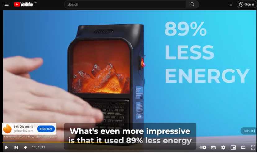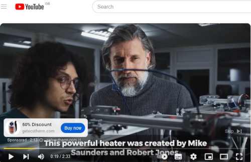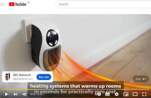 In Britain in January and February 2024 YouTube was showing fraudulent adverts for electric heaters. These included claims such as “It can warm up rooms in minutes, costing only a few pennies per day.”, “uses less energy than non ceramic heaters”, “used 89% less energy compared to regular heating systems”. The adverts linked to websites that declared a business address in Lithuania.